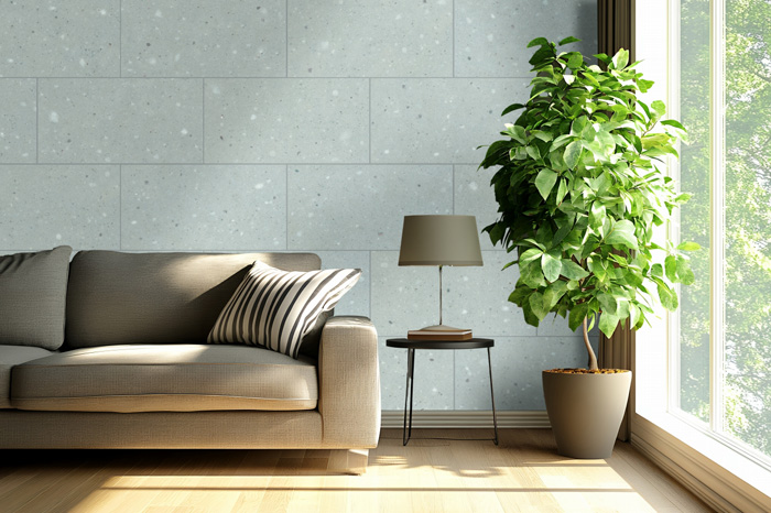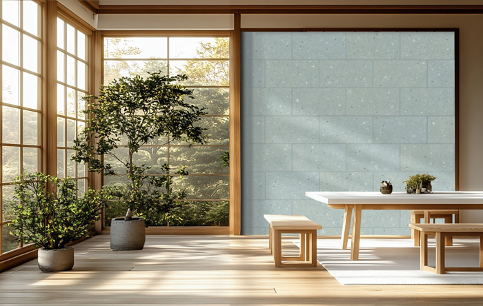 「秋保石」は宮城県仙台市の秋保町を産地とする凝灰岩で、大小さまざまな小石が混じリ合うことで生み出される特長的な柄が魅力です。そのナチュラルな風合いを再現したパネルはインテリアに親しみやすさをもたらします。